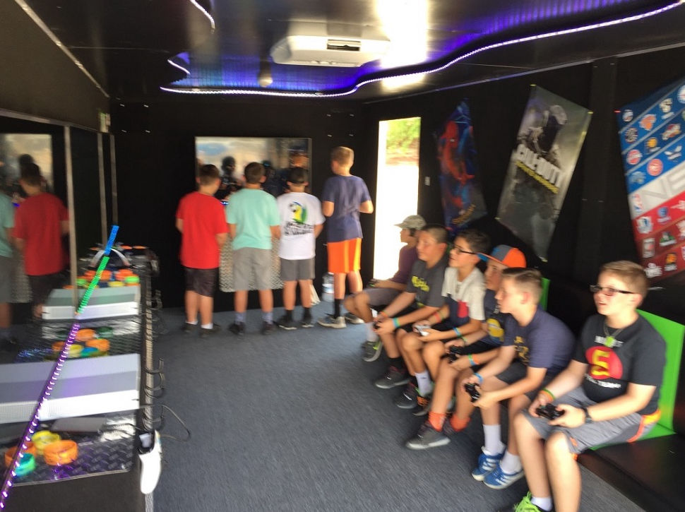 The gaming trailer is a five TV setup​, four 55" TVs on the inside and one 65" TV on the outside allowing plenty of room to play your favorite games. PS5, PS4 and Xbox Series X consoles loaded with all of your favorite games. A custom seven-foot interior clearance, carpeted floor, black felt walls, and a climate-controlled environment makes this trailer available year-round for gaming. The full LED light package on the inside and outside gives it the WOW factor while parked at your party or event. This a very spacious 22' gaming trailer that has one purpose. Gaming and Goodtimes